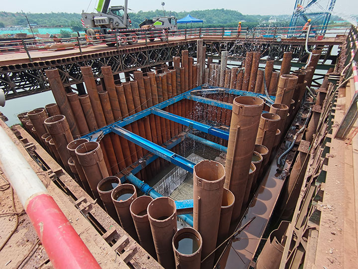 蟠龍大橋主橋涉水施工措施是技術(shù)難點(diǎn)、重要性節(jié)點(diǎn)、施工危險性較大工程之一,主要技術(shù)難點(diǎn)在于水中墩柱承臺的圍堰施工,針對薄覆蓋層硬質(zhì)河床、承臺入巖等水文地質(zhì)、設(shè)計要求,工程管理公司黨總支在蟠龍大橋項目成立黨員先鋒隊攻堅小組,精心組織、知難而上、勇于探索,在水中P17#、P18#墩采用了“成套鎖扣鋼管樁(φ630)+全套管全回轉(zhuǎn)鉆引孔開槽+清槽嵌固+封底”的圍堰方案,成功破解了項目建設(shè)中,水中薄覆蓋層硬質(zhì)河床引孔開槽、鋼管樁搭設(shè)鎖扣、反循環(huán)清槽、細(xì)石混凝土封槽、鎖扣止水等技術(shù)難點(diǎn)。