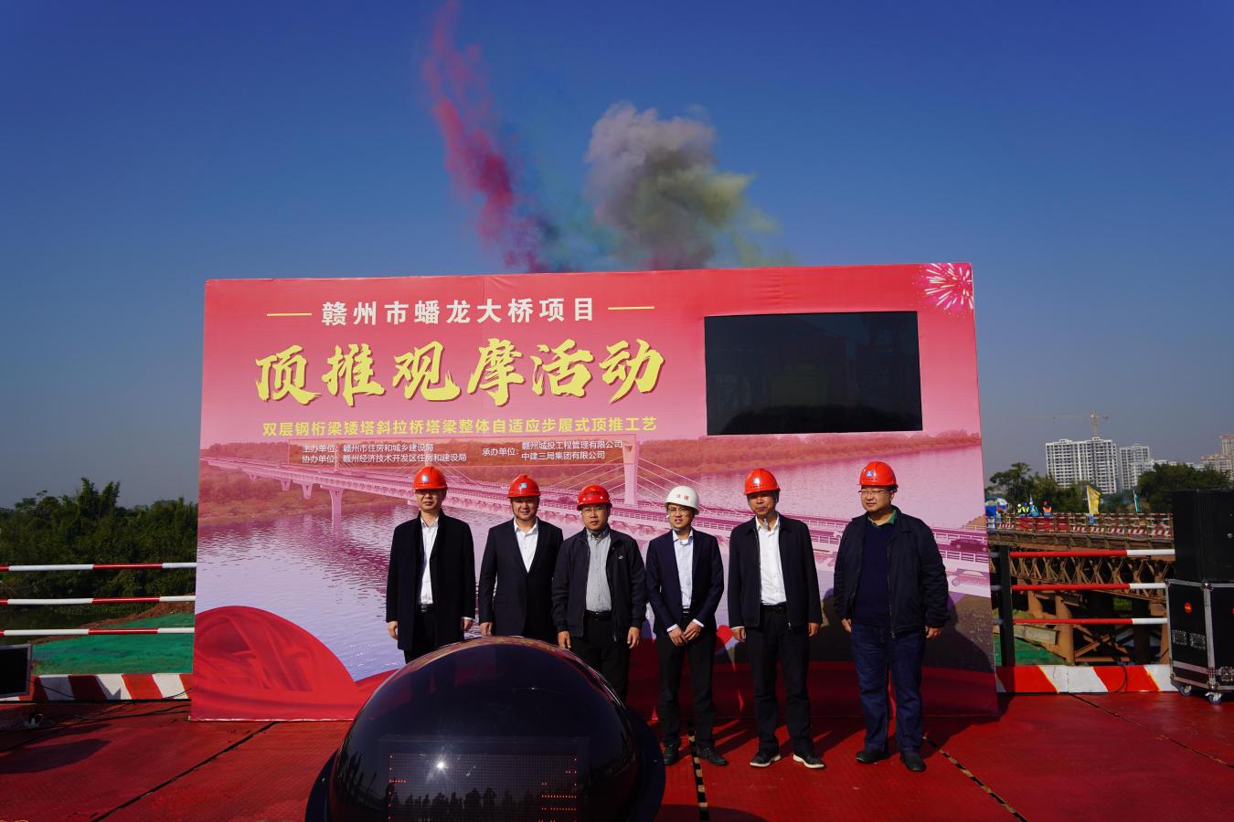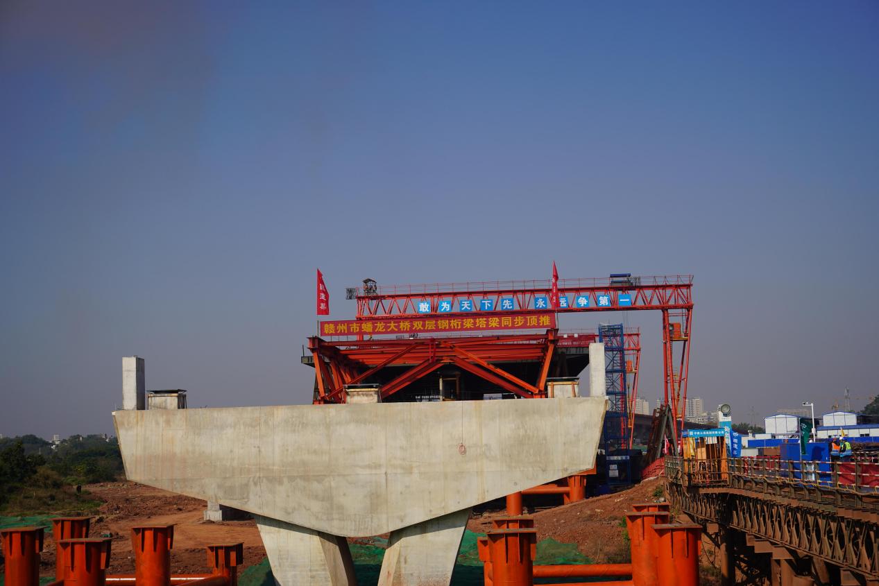 12月6日,贛州市蟠龍大橋項(xiàng)目主橋鋼結(jié)構(gòu)首次頂推啟動(dòng),為主橋的順利推進(jìn)打下堅(jiān)實(shí)基礎(chǔ),標(biāo)志著該項(xiàng)目取得了全市重點(diǎn)項(xiàng)目建設(shè)百日攻堅(jiān)活動(dòng)任務(wù)目標(biāo)的節(jié)點(diǎn)性勝利。贛州經(jīng)濟(jì)技術(shù)開發(fā)區(qū)住房和建設(shè)局,贛州城投工程管理公司、中建三局總承包公司等參建各單位代表共計(jì)60余人參加頂推啟動(dòng)活動(dòng)。
