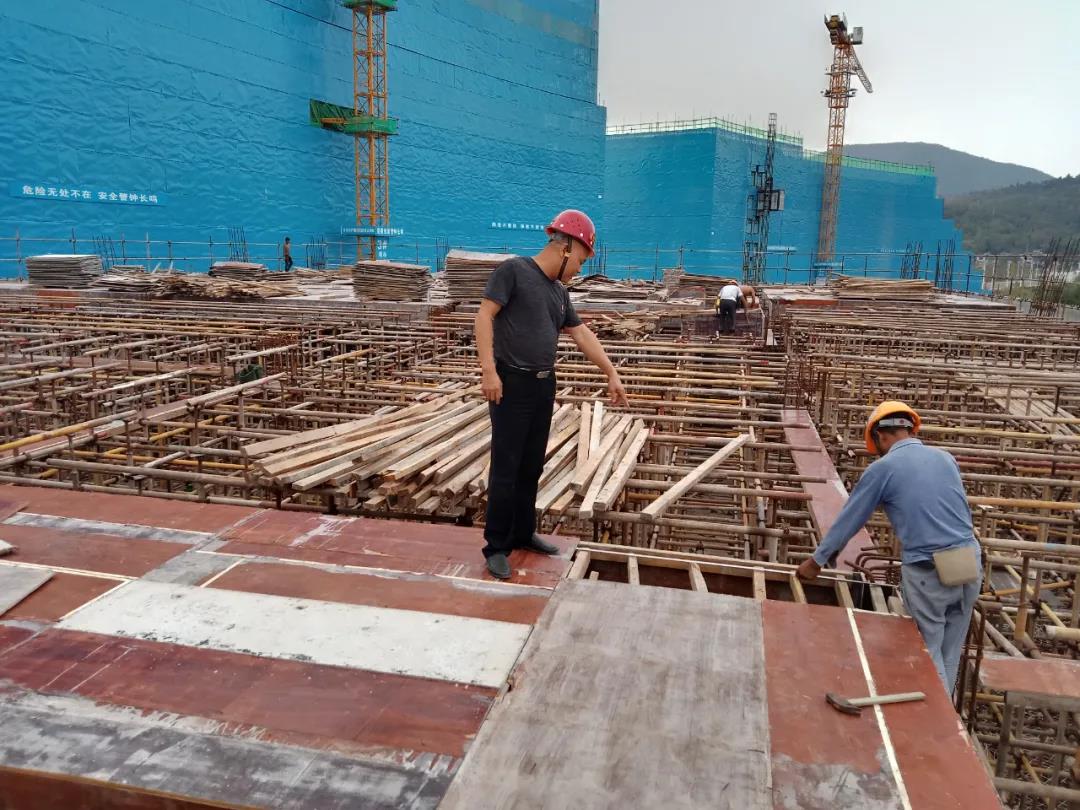 在中國科學(xué)院贛江創(chuàng)新研究院一期新建項(xiàng)目,工程管理公司項(xiàng)目經(jīng)理在項(xiàng)目施工現(xiàn)場指導(dǎo)木工作業(yè)。