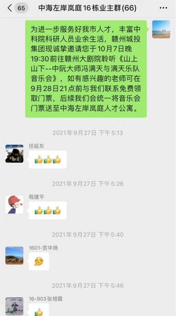 9月17日,支部書記帶隊再次到人才公寓走訪,了解到科研人員平時忙碌、業(yè)余文化生活不豐富,大部分科研人員中秋國慶期間因離家較遠和疫情防控將留贛。為滿足人才精神文化需求,民晟實業(yè)公司聯(lián)合贛州市保利劇院管理有限公司,在“文化惠民”政策下,邀請留贛科研人員在贛州大劇院免費聆聽“山上山下”中阮演奏音樂會,黨員先鋒隊成員還專程送公益票上門。消息一經(jīng)人才公寓業(yè)主群發(fā)出,反響熱烈,獲得科研人員頻頻“點贊”?!案兄x你們的關(guān)心關(guān)懷和貼心服務(wù),讓我們國慶留贛能聽一場名家現(xiàn)場音樂會!”領(lǐng)票現(xiàn)場,一位科研人員說道。