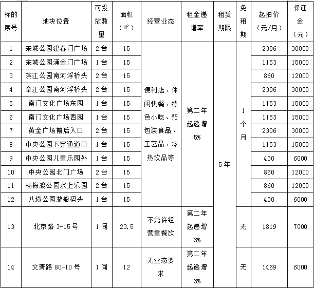 以上清單內(nèi)容僅供參考,以現(xiàn)狀交付,拍賣公司和委托人不承擔(dān)瑕疵擔(dān)保責(zé)任,其中標(biāo)的1-標(biāo)的12僅提供場地,競得人負(fù)責(zé)花車經(jīng)營設(shè)備投資、日常經(jīng)營(包括經(jīng)營秩序、場地保潔、垃圾清運、污水廢水處理)。