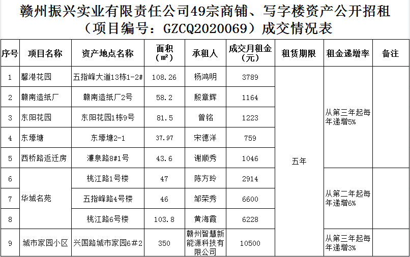 2020年10月27日上午10時,在贛州市公共資源交易中心舉行的贛州振興實業(yè)有限責任公司49宗商鋪、寫字樓資產公開招租(項目編號:GZCQ2020069),現(xiàn)將公開招租成交情況公示如下: