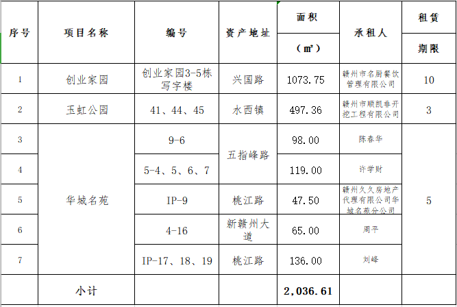 2021年5月28日下午14時30分,在贛州市公共資源交易中心舉行的贛州振興實業(yè)有限責(zé)任公司五指峰路等十三宗資產(chǎn)公開招租(項目編號GZCQ2021073),現(xiàn)將公開招租成交情況公示如下: