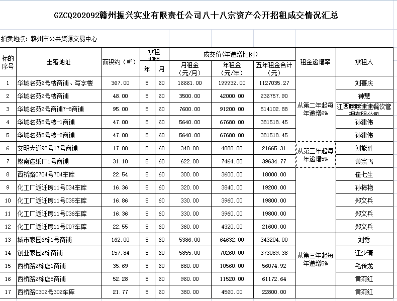 2020年11月25日上午10時,在贛州市公共資源交易中心舉行的贛州振興實業(yè)有限責任公司八十八宗資產(chǎn)公開招租(項目編號:GZCQ202092),現(xiàn)將公開招租成交情況公示如下: