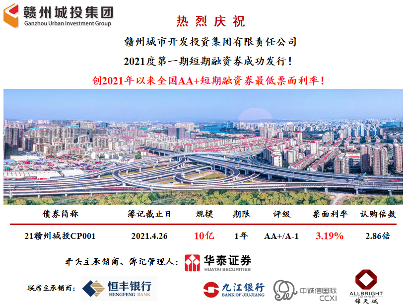 4月26日,贛州城投集團(tuán)2021年度第一期短期融資券成功發(fā)行,金額10億元,發(fā)行利率3.19%。該債券是2021年以來全國同主體評(píng)級(jí)AA+短期融資券最低利率,也是集團(tuán)戰(zhàn)略發(fā)展部黨支部黨員學(xué)黨史、悟思想、辦實(shí)事、開新局的又一工作成效。