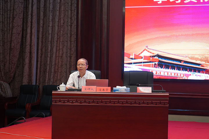 莊春賢以“牢記初心擔(dān)使命,砥礪奮進(jìn)新征程”為題,從“深刻領(lǐng)會(huì)習(xí)近平總書記”七一“重要講話的重大意義,切實(shí)把學(xué)習(xí)貫徹講話精神作為一項(xiàng)重大政治任務(wù)抓緊抓好;全面把握習(xí)近平總書記”七一“重要講話的豐富內(nèi)涵,深入理解講話提出的一系列新思想新觀點(diǎn)新論斷;準(zhǔn)確把握習(xí)近平總書記”七一“重要講話的實(shí)踐要求,縱深推進(jìn)新時(shí)代贛南蘇區(qū)振興發(fā)展“三個(gè)方面”,通過(guò)引用偉大的革命先驅(qū)為中華民族的偉大復(fù)興而奔走奮斗的英雄事跡,深刻闡釋了偉大建黨精神譜系和以史為鑒、開創(chuàng)未來(lái)”九個(gè)必須“的根本要求,對(duì)習(xí)近平總書記”七一“重要講話進(jìn)行了系統(tǒng)闡述和重點(diǎn)解讀。